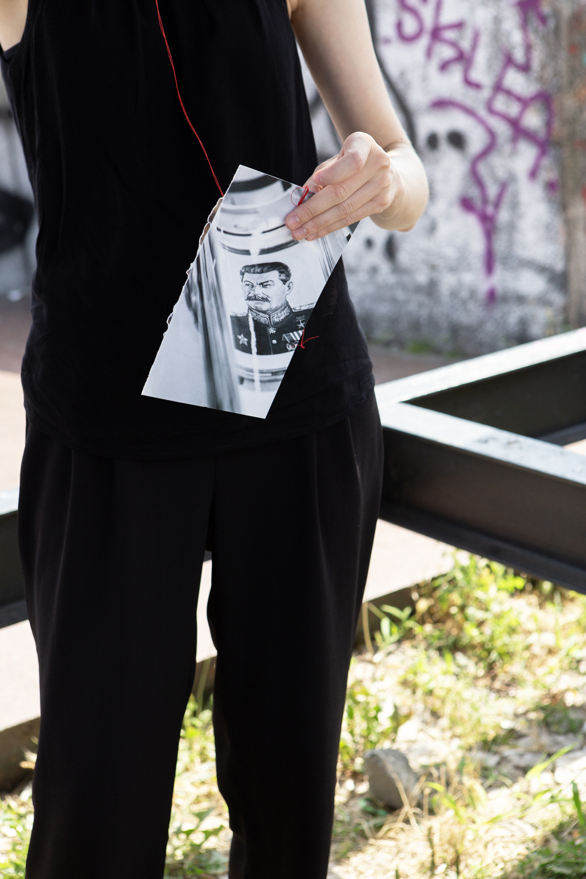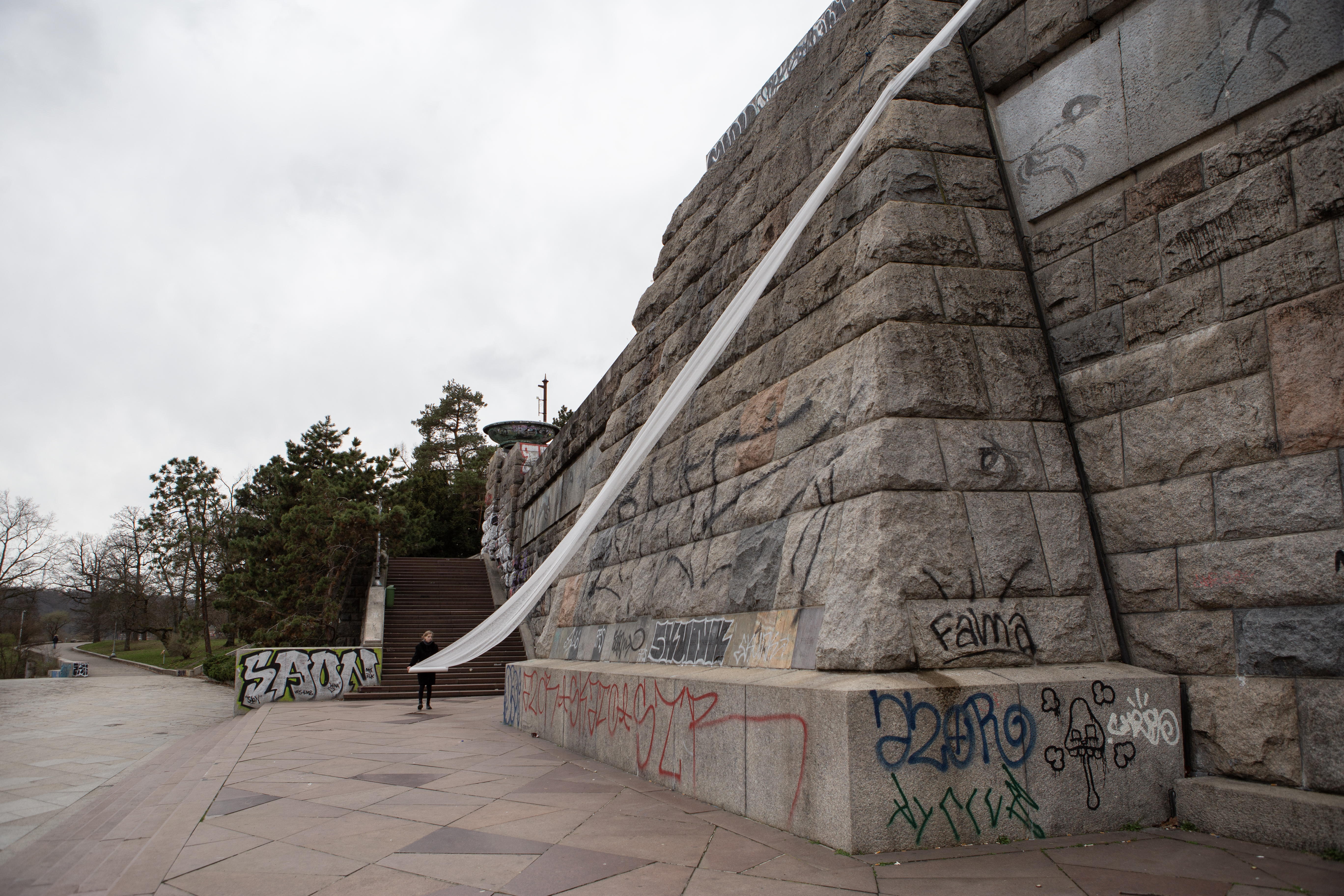 Drawing on the ritual practices that took place at the Stalin monument, I created several unannounced performative situations. For these interventions, I selected symbolic objects from the Academy of Sciences of the Czech Republic, such as coal and stones. The interventions were documented by Ukrainian artist Kateryna Khramtsova, with the aim of revisiting the performances of the past, particularly the minimalist performances of the 1970s in Prague, and to personally experience the injustice of totalitarian regimes. Despite the silence surrounding them, totalitarian practices have been preserved and persist to this day.