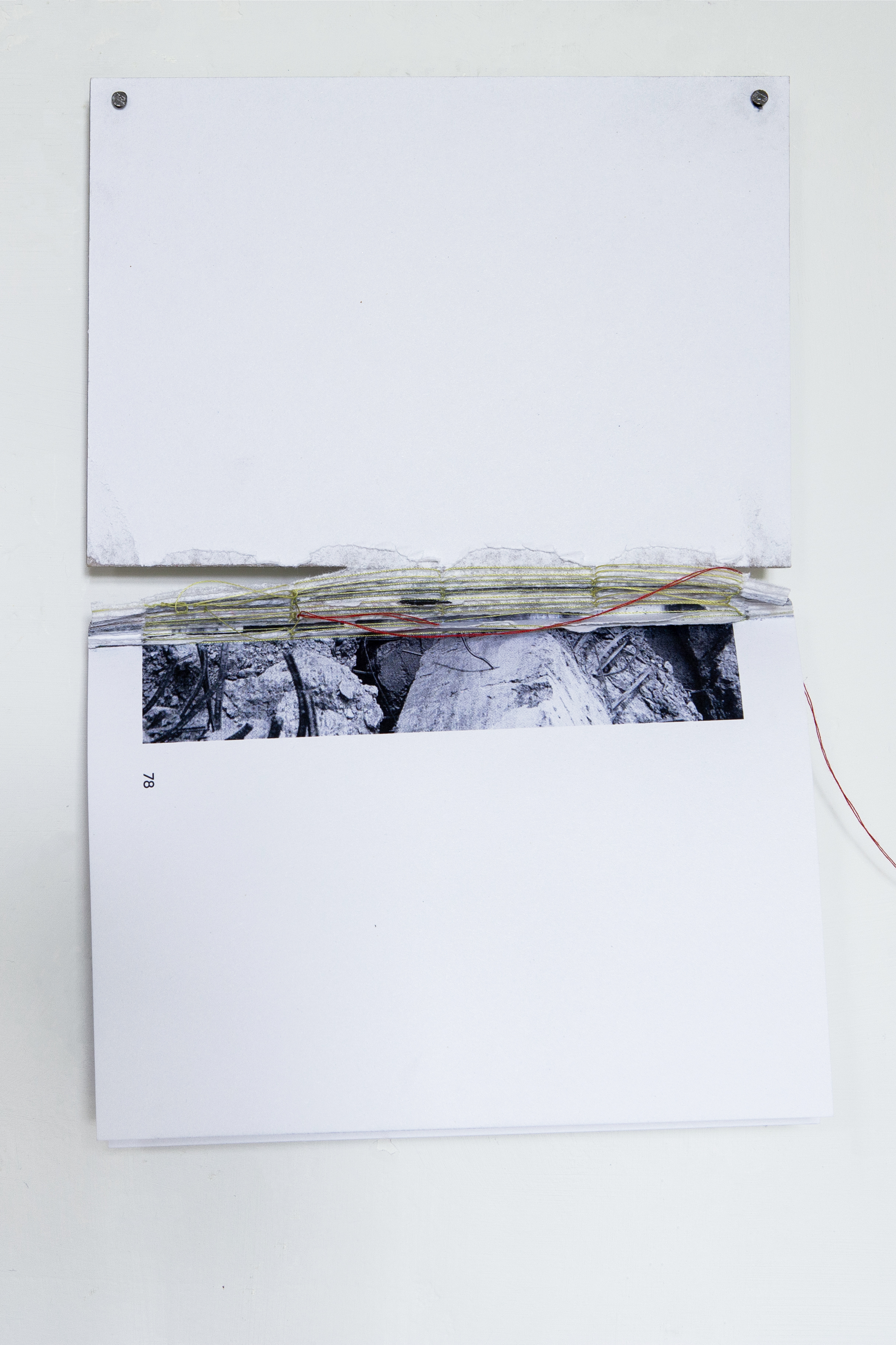 Torn pages from the book Layers, red thread and needles, pins, a frame found in the basement of the cemetery, a spider web, tree trunks and branches found in the cemetery.