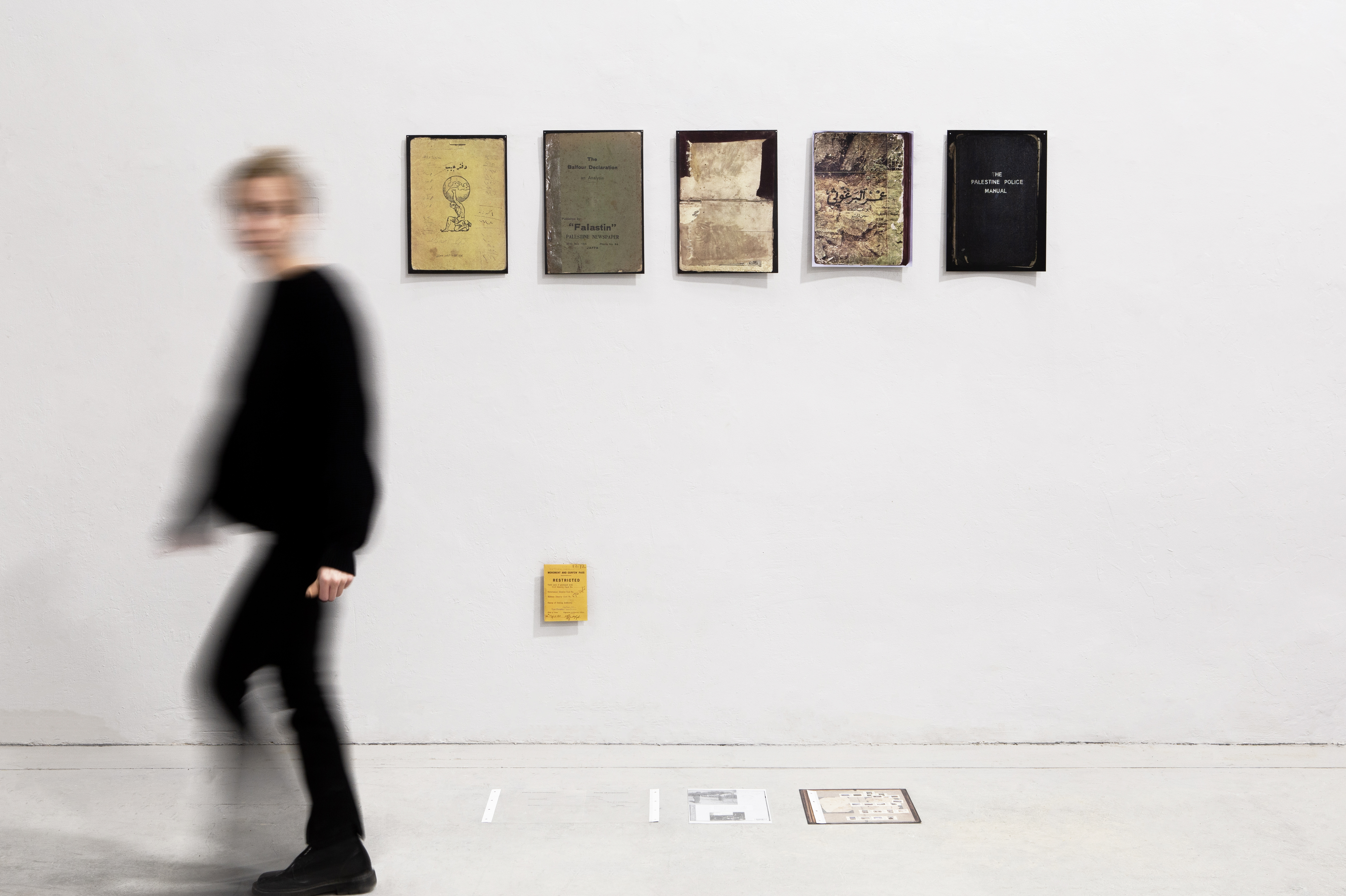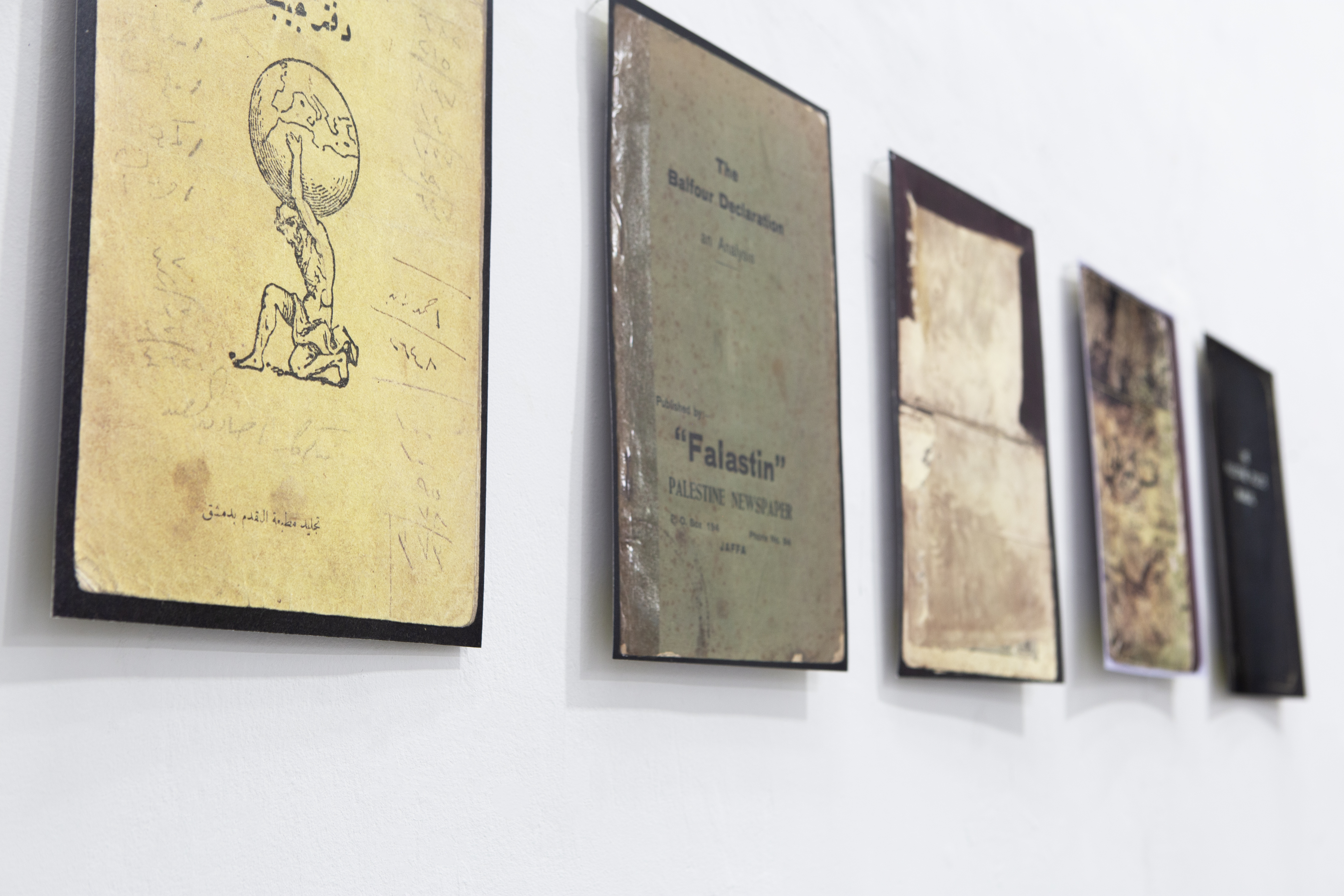 incorporating archival materials and photographs of books sourced from the Palestinian Museum Digital