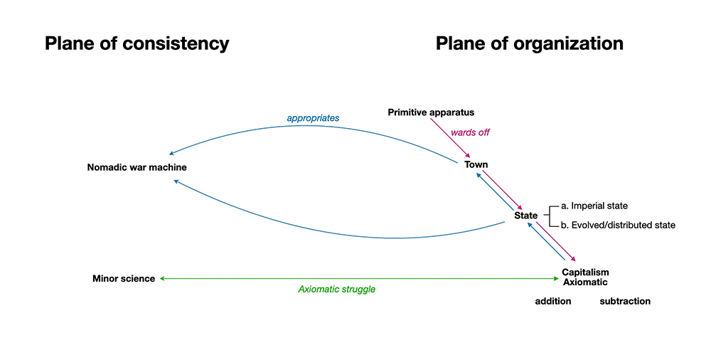 the war machine, an apparatus of destruction operating under its own logic of power and territorial control.