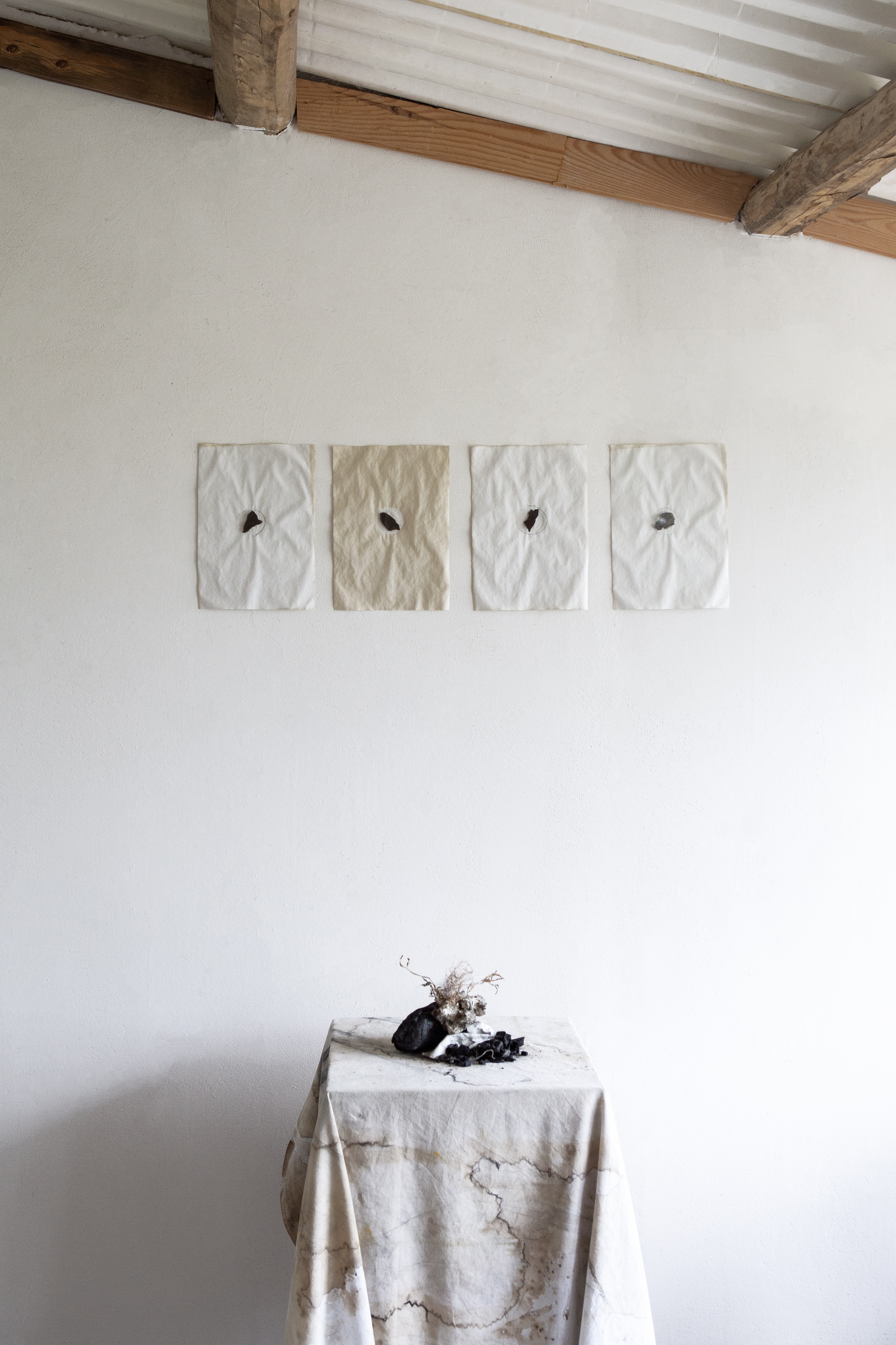 Site-specific installation, drawings, a piece of canvas, blanket, coal, shells, stones, marble pieces, found newspapers placed in a glass bottle, dirt, 2024